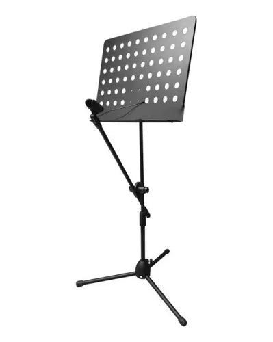 Atril para partituras con brazo ajustable (boom) y soporte para micrófono, perfecto para músicos que necesitan versatilidad en escenario o estudio. Construcción robusta, diseño portátil y múltiples puntos de ajuste.